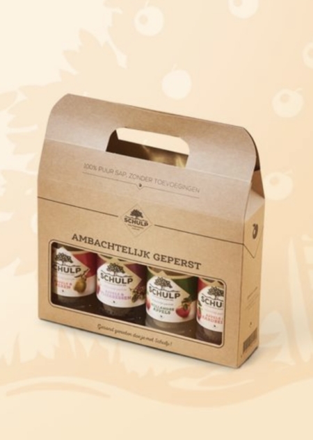 Leuk cadeau set met 4 heerlijke flesjes Schulp sap van 200 ml.