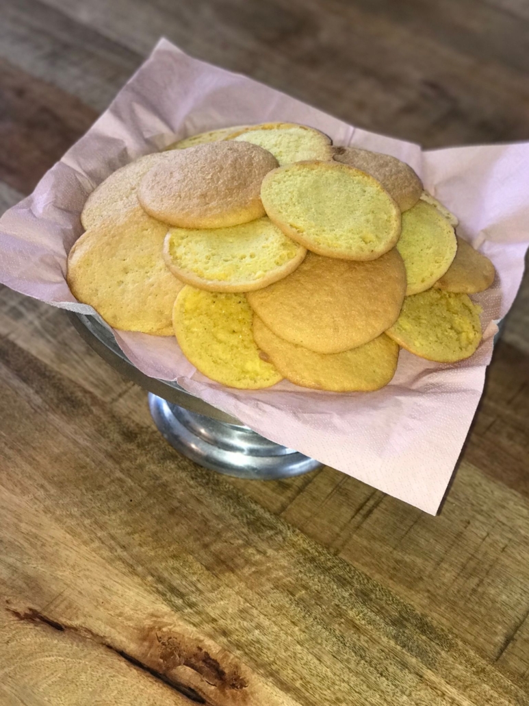 Eieren in 3 minuten met een mixer schuimig kloppen. Mix zeven en toevoegen, goed mengen. Bakblik met bakpapier bedekken en 6 eetlepels deeg erop scheppen. In een op 180° voorverwarmde oven in 10 minuten gaar bakken. Op een rooster even af laten koelen maar niet te lang anders drogen ze uit.